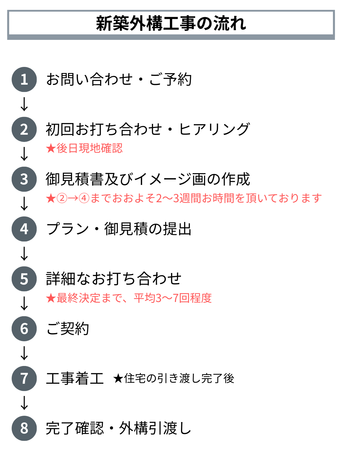 新築外構工事のご相談は、建物の最終図面完成~引渡しの3-4か月前がおすすめです。